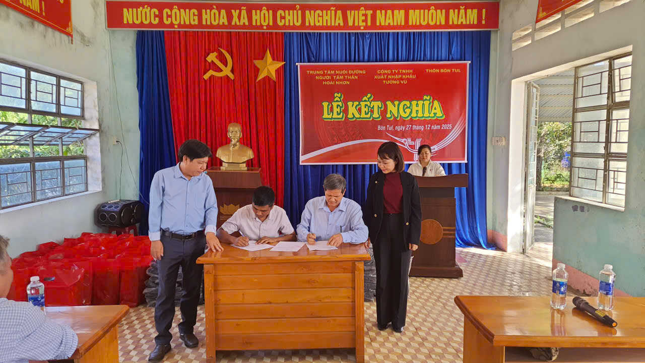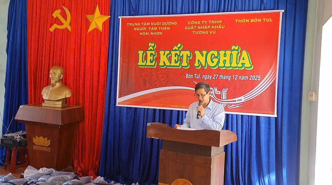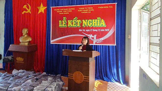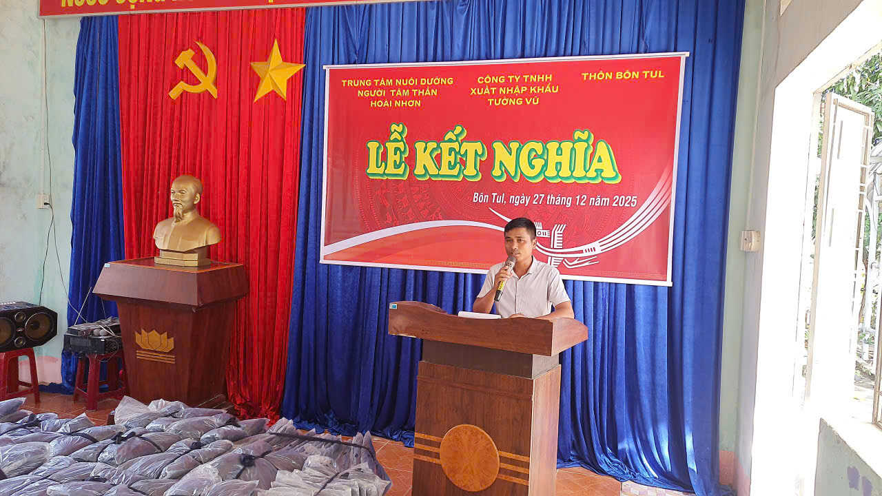 Chiều ngày 27/12/2025, tại Nhà sinh hoạt cộng đồng thôn Bôn Tul (xã Ia Tul), Trung tâm Nuôi dưỡng người tâm thần Hoài Nhơn đã phối hợp cùng Công ty TNHH Xuất nhập khẩu Tường Vũ tổ chức Lễ kết nghĩa với thôn Bôn Tul. Đây là hoạt động ý nghĩa nhằm tăng cường khối đại đoàn kết toàn dân tộc và hỗ trợ phát triển kinh tế – xã hội tại địa phương.